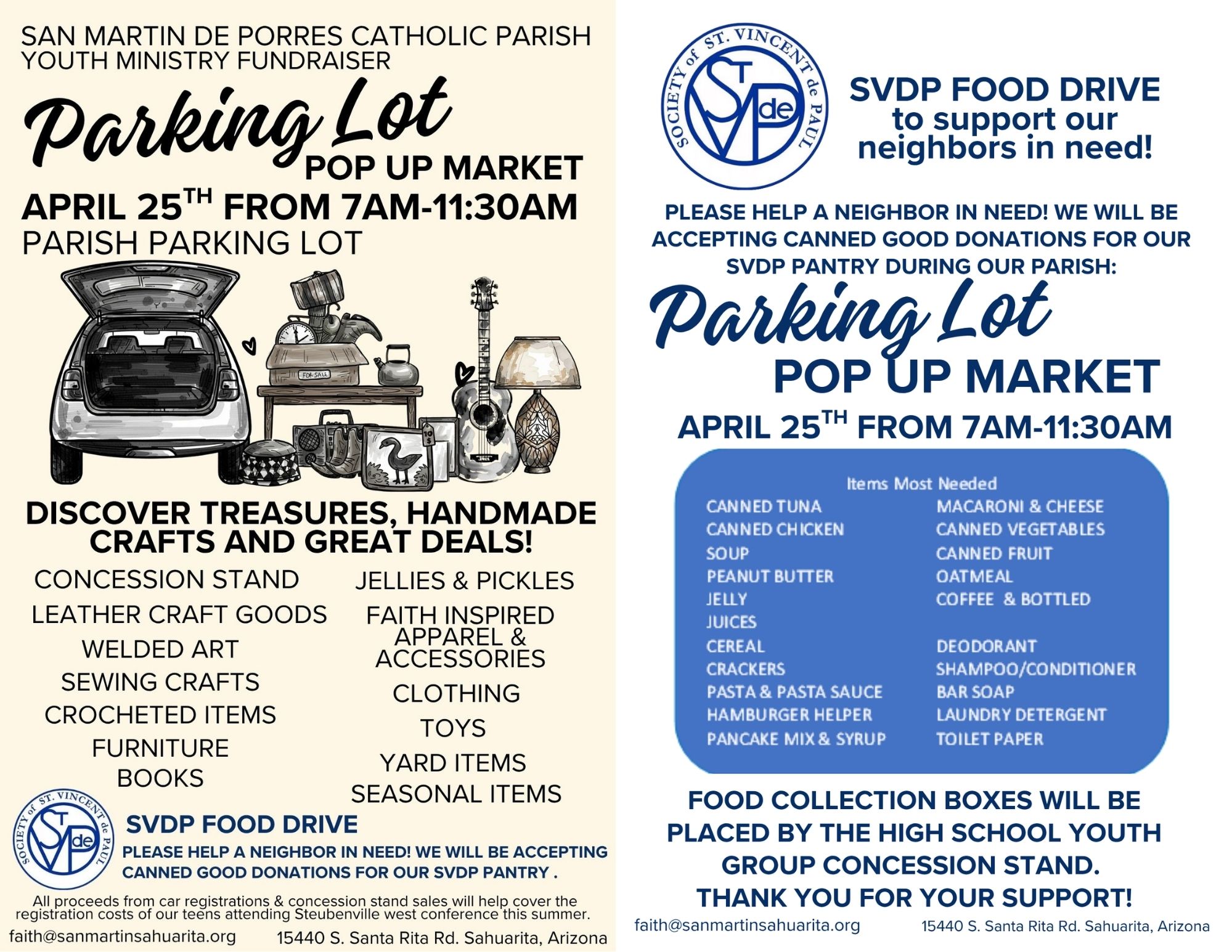We have a space for you! Come sell your wares from the trunk of your car in a double-space parking area. To register contact our parish office at 520-625-1154 $20 per car. This is a youth ministry event. All proceeds from this fundraiser will benefit teens attending the Steubenville Conference this summer at the TCC.